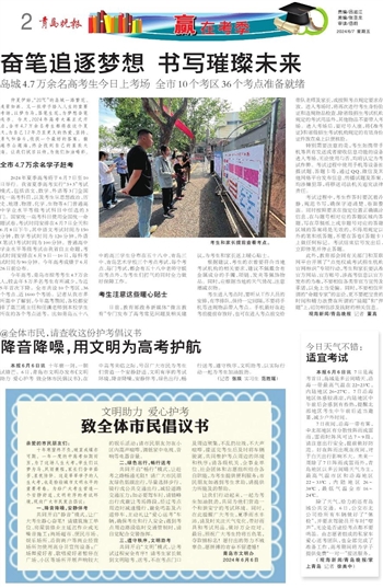 本报6月6日讯 十年磨一剑,一朝试锋芒。6日,青岛市文明办发布《文明助力 爱心护考 致全体市民倡议书》,在中高考来临之际,号召广大市民为考生们营造一个安静舒适、文明有序的考试环境,降音降噪,安静伴考,绿色出行,畅行送考,遵守秩序,文明助考,以实际行动一起为考生加油鼓劲。