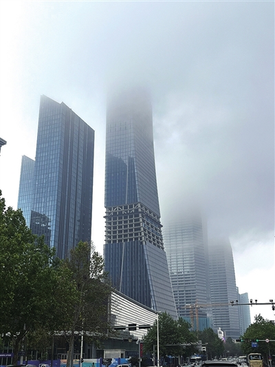 高达328.6米的绿城深蓝中心耸入云雾中。张琰 摄