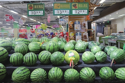 利群超市琳琅满目的西瓜。 马妮娜/ 摄