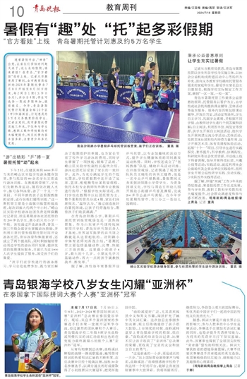 “曲聆溪爱好广泛,尤其喜欢阅读中文和英文书籍,阅读扩充了她中英文词汇量。这次独自去泰国参加决赛,班主任陈晓斐给了孩子很大鼓励,上台领奖的时候,曲聆溪特意穿上青岛银海学校的校服,很自豪。”曲聆溪的母亲告诉记者,比赛不仅让孩子收获了“亚洲杯”总决赛的荣耀,更收获了宝贵的友谊和独立自主的勇气。