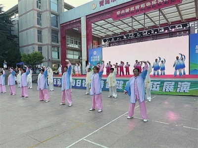 本报8月8日讯 8日,市北区全民健身日社区特色健身队伍展演在浮山新区街道社区大舞台举行。现场,在健身站点联赛、特色健身队伍评选中获奖的队伍代表进行展示,虎虎生威的武术剑法,刚柔并济的健身功法,如行云流水的太极拳术,活力悦动的健身操、匹克球操……展现着传统与创新、继承与发展的体育健身热潮。
