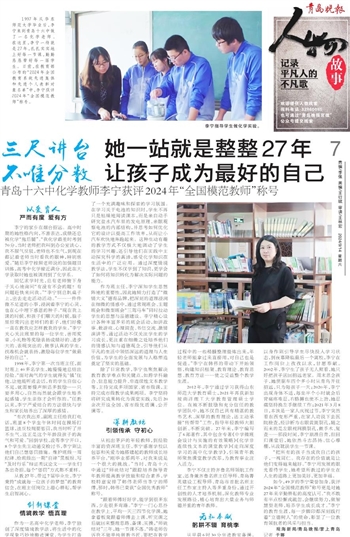 1997年从华东师范大学毕业后,李宁来到青岛十六中做了一名化学老师。在这里,李宁一待就是27年,扎扎实实地上好每一节课,勤勤恳恳带好每一届学生。日前,在教育部公布的“2024年全国教育系统先进集体和先进个人表彰对象名单”中,李宁获评2024年“全国模范教师”称号。