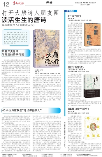 鲜活,立体,系统。这是薛易总结的《大唐诗人行》的关键词。“鲜活,因为我重点写的是人,是诗人的人生历程。用讲故事的方式写唐诗,而不是单纯地做诗歌赏析。”书中,薛易重点写的是一首诗是诗人在他的哪个人生阶段、在什么历史背景下写出来的,在他的人生中居于怎样的位置。“这样可以让唐诗有更浓的人味儿,从而摆脱符号化,不是只背过某个名句就行了。”