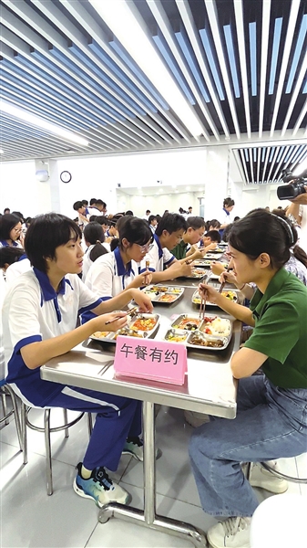 青岛实验初中师生在食堂堂食区享用美味午餐。 张琰 摄