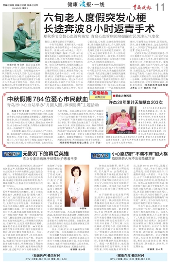 中秋假期,青岛市中心血站举办了“月圆人圆,事事圆满”主题活动,迎来了广大献血者的积极参与,节味十足。大家在献血后纷纷抽取爱心卡,写下自己的节日祝福,贴在祈福书上,有对家人的关爱,有对朋友的祝愿,也有对陌生人的祝福。在血站机采大厅,青岛市“献血状元”李鸿波,百次献血者徐光发、杨升,“热血公仆”马仁山和他的妻子等纷纷来打卡。9月16日,“熊猫侠”石强来到胶州宝龙献血屋捐献全血2单位,累计捐献全血量达到了1万毫升。自2010年以来,石强坚持献血25次,每次得知临床急需“熊猫血”,他都会第一时间响应。在莱西月湖广场献血屋,崔先生顺利完成第4次献血,妻子带着不满一岁的女儿陪在身边为他加油鼓劲。董晓华带着刚上一年级的儿子来到莱西献血服务部,再次捐献血小板2个治疗量。