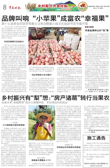 11月2日,第十五届青岛旧店苹果展示交易会暨第六届文化旅游节在平度市旧店镇泰德文化广场开幕。本届交易会由青岛旧店果品专业合作社主办,以“五彩秋色 硕果邀约”为主题,注重农业特色、突出农民主角,致力彰显新质生产力特征。