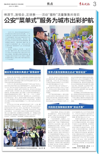 啤酒节、演唱会、足球赛……经济升温、城市“圈粉”背后,随之而来的是治安压力,青岛市公安局把护航大型活动作为实施主动警务、预防警务成果的重要检验,着力构建大型活动安保“专业+机制+大数据”新型警务模式,持续为城市高质量发展注入“平安动能”。