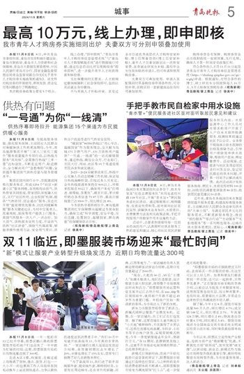 近年来,青岛水务海润自来水集团持续提升服务质量,构建高标准服务体系,主动解决好人民群众身边事关供水的“大事小情”。为满足居民多元化的服务需求,不断更新服务理念,推出 “预约服务”“零点行动”“主动服务”“无拒绝服务”等一系列特色服务,让城市供水服务更便民、更贴心。(观海新闻/青岛晚报/掌上青岛 记者 徐美中)