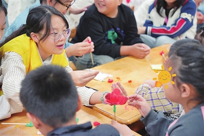 志愿者教孩子们做泥塑。栾丕炜 摄