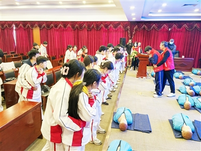 志愿者仇兆强在给中学生们培训急救知识。 刘卓毅 摄
