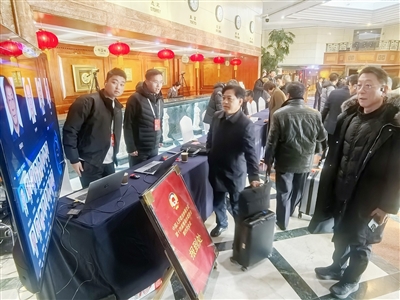当天下午,记者在汇泉王朝大饭店大堂里看见,前来报到的政协委员经过安检区后,站到扫描区盯着摄像头不到三秒,一旁的大屏幕上显示出委员的照片和姓名,完成了“刷脸报到”。随后,他们和前台工作人员确认房间号码,直接步入电梯前往房间。常言道,“没出十五都是年”,记者注意到,很多相识的政协委员见面后,纷纷道上一句“过年好”。