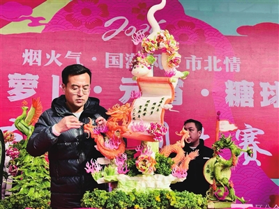 中国北方素有正月初九咬春的习俗,咬春即吃萝卜。萝卜雕刻大赛于6日下午在广兴里举行,20余位雕刻大师现场展示技艺,用刻刀创作出一个个精美的萝卜雕刻作品,活动现场评选出了本届萝卜雕刻大赛获奖作品,进行集中展示。精美雕刻作品让现场市民游客大饱眼福。