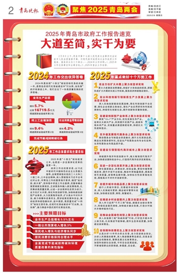 2月8日上午,青岛市第十七届人民代表大会第四次会议在市人民会堂隆重开幕。任刚代表市政府向大会作政府工作报告。报告共分为三个部分:一、2024年工作回顾;二、2025年工作总体要求和主要目标;三、2025年重点工作安排。
