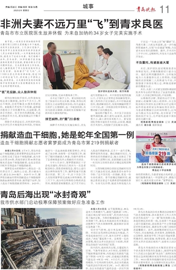 本报2月8日讯 2月8日,青岛市造血干细胞捐献志愿者窦梦茹在青岛市中心医院完成了造血干细胞捐献,成为青岛市第219例、西海岸新区第46例非血缘关系造血干细胞捐献者,也是全国农历蛇年首例造血干细胞捐献者。