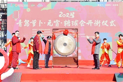开街仪式上中车科技园(青岛)有限公司总经理彭广辉,中国好人、全国最美基层民警、省、市级道德模范、青岛市公安局市北分局兴隆路派出所社区民警马怀龙,第五批省级非物质文化遗产代表性项目青岛高家糖球制作技艺代表性传承人高士湘共同上台,依次敲响海云大锣,用传统仪式为大家送上新春的祝福。