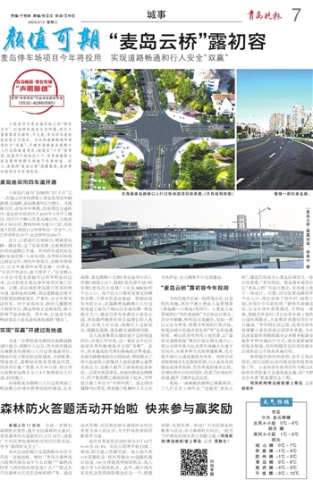 小麦岛作为青岛海岸线上的“绿色宝石”,以独特的海岛生态环境,吸引大量游客前往游玩,不久前,双向四车道的麦岛路正式通车。为实现道路畅通和游客打卡“双赢”,开建东海路麦岛路路口人行过街地道项目,地道呈“口字”型布置,设置四个地面出入口,其西南象限与麦岛路西侧停车场地下车库相连。近日,浪漫的“麦岛云桥”展露面容,麦岛停车场项目今年将投用。