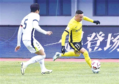 青岛西海岸队戴维森(右)在比赛中进攻。新华社发
