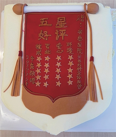 为了表示感谢,她精心定制了一个锦旗样式的蛋糕,独特设计的蛋糕既表达了她对关节外科医护团队的感谢,也传递着她缓解病痛之后的轻松和幸福。
