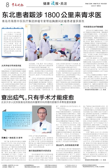 1月22日,当大多数人与家人团聚时,一名来自黑龙江齐齐哈尔的胸膜间皮瘤患者,在家人的陪伴下,冒着严寒在深夜抵达青岛市海慈中医医疗集团肿瘤中心二科病房。经过一段时间的治疗,患者的病情得到控制,流感、肺部感染和胸水明显好转,疼痛和喘憋也显著减轻,患者目前已顺利出院。