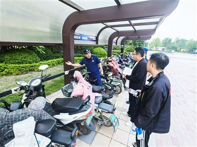 防火监督员在检查电动自行车集中充电点的消防安全。(资料照片)