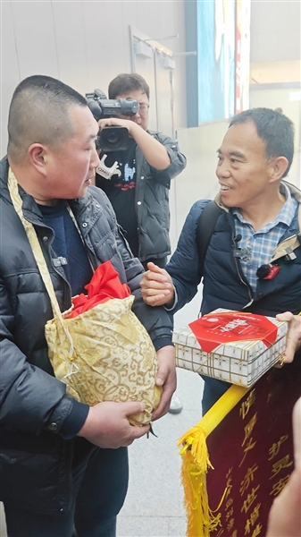 刘吉泰的儿子已过世,他生前嘱咐其子一定要把爷爷找回来。刘吉泰的孙辈坚持辗转寻亲不放弃,终于从刘德文的手中接回爷爷的骨灰。“爷爷回家了,回来了……”两人跪在地上交接骨灰盒时,刘吉泰的孙辈眼含热泪,颤抖的双手无处安放。“小刘告诉我,希望清明节前将爷爷安葬,以告慰父亲未了的心愿。小刘的孝顺感动了我。” 刘德文说,他特意带来台湾特产太阳饼给小刘一家。太阳饼是圆形的,寓意团圆平安。