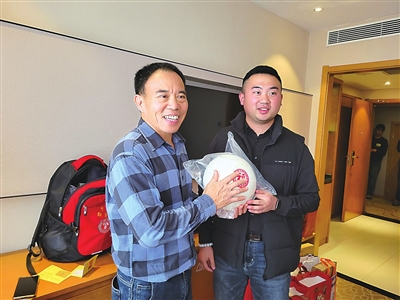 王哥庄大馒头协会委托刘德文(左)把家乡大馒头带回台湾。张译心 摄