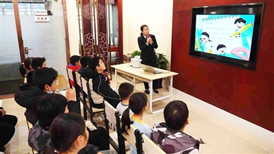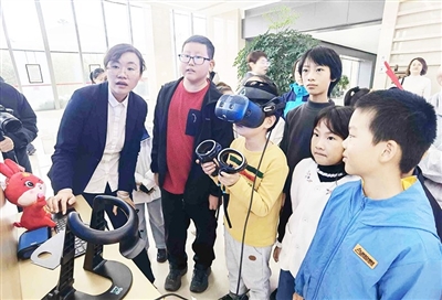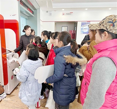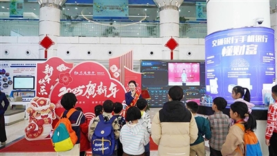 交通银行青岛分行工作人员带小记者参观智能厅堂。