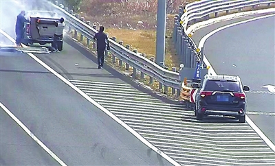 “我当时就看到他的车在冒烟,我还以为是缺机油,后来看到车辆停在路边,车斗里在冒烟,我马上意识到是起火了。”赵鹏飞回忆,为了安全,他赶紧把自己的车停在匝道导流线内,拎着车里的保温瓶就冲了过去。