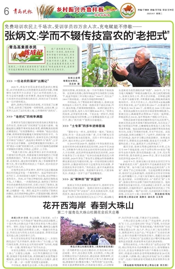 2022年9月,张炳文被山东省农业农村厅评为“高素质农民大师”,连续两年开设高素质农民“师傅带徒”班。如今他已成为青岛远近闻名的“土专家”,拥有了自己的粉丝群。无论他到哪里讲课培训,粉丝们总会如影随形,而张炳文对待学员和粉丝,始终慷慨大方,只要大家有疑问,他总是倾囊相授、毫无保留。从田埂到讲台,从“老把式”到“土专家”,张炳文用半生诠释了新时代农民的担当。他的故事里没有豪言壮语,只有沾满泥土的双手、永不疲倦的脚步,在他的带动下,越来越多的农民走上了科技致富的道路,一幅产业兴旺、生活富裕的乡村振兴画卷,正在这片土地上徐徐展开。 青岛晚报/观海新闻/掌上青岛记者 高静文 通讯员 江玉萍