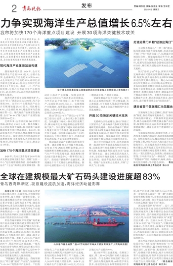 2025年,我市以《青岛市2035年海洋发展远景规划》为指引,围绕“五区一中心”定位梳理建设路径,启动编制《青岛市“十五五”海洋经济发展规划》。推动壮大海洋产业规模。加快总投资2400亿元的170个海洋重点项目建设,力争年内40个项目竣工、20个项目投产,完成投资400亿元以上。实施精准产业链招商、统筹联合招商和载体平台招商,力争全年新引进项目150个以上、总投资过1000亿元。