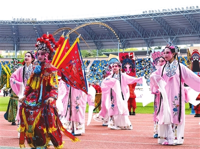 青岛新世纪市北学校学生方队将传统文化与现代运动完美融合。于娜 摄