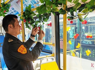 走进车厢,仿佛踏入了一片樱桃果园,车窗、内壁张贴着色彩鲜艳的樱桃水果图案,让人眼前一亮。车厢扶杆上,缠绕着栩栩如生的樱桃绿藤,营造出浓浓春日氛围,为假期出行乘客的旅途增添了一份别样浪漫。驾驶员吴相月更是别出心裁,准备了小粘贴,乘客上车就能收到这份特别的礼物。