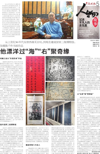 2014年赵敦玲回到青岛,在中央商务区连云港路买下一栋面积5600平方米的三层楼房。3年后,连云港路通车,他开始筹建博物馆。2019年5月18日青岛海右博物馆如期开馆。2024年5月,海右博物馆被评为国家二级博物馆,成为青岛民营博物馆中的佼佼者。记者了解到,目前多数民营博物馆以民俗类收藏为主,主要保存和呈现乡村记忆,此外还有工业博物馆和红色题材博物馆。海右博物馆作为专业展陈古字画的博物馆能够成功晋级二级博物馆,非常难得。