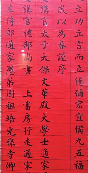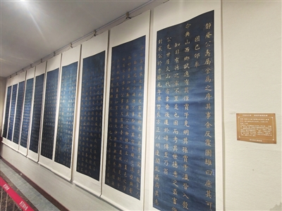 据赵敦玲介绍,馆藏主要分为四个系列,古字画、古玉器、古皮影、汉画像石。寿屏是古代达官贵人给寿诞者的寿文、寿词,是祝寿的最高礼仪形式。海右博物馆收藏寿屏48套,时间跨度从清代康熙44年到民国时期,是全国为数不多的大量收藏寿屏的博物馆。寿屏历史文化价值颇高,寿屏字数在一两千字,书写一气呵成,极具书法价值;寿屏多为翰林进士撰文,具有文化价值;记载战争、迁徙等,也有一定的史料价值。海右博物馆展出的一组乾隆年间红色绢本寿屏,当时的丝绢使用天然染料制作,距今已200多年,丝绢没有褪色,令人折服。在展的一组康熙44年寿屏,是湖南的一位翰林用金粉在蓝色绢布上写成,距今300多年了,金字没有脱粉,蓝色仍较为鲜艳,品相十分完整。“如此品相,业内称为‘神品’,当时收藏者把这组寿屏装入木盒,用油布包裹,再封上蜡,埋入地下,流传至今。” 赵敦玲说。