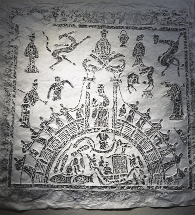 上世纪50年代鲁西南一带兴修水利时,挖出不少汉画像石,古人以刀代笔,在石头上作画,记录历史典故、生活场景等,如士大夫车马出行、接待宾客、喝酒下棋等,栩栩如生、惟妙惟肖。博物馆收藏的一件汶上出土的胡汉战争石画像,采用高浮雕加游丝毛雕工艺,全国少见。一件“泗水捞鼎”的画像讲述大禹治水时铸了9个鼎,泗水有一个,秦王东游得知后,组织人力打捞,当鼎要出水时,跳出一只龙把绳索咬断,鼎落水后消失不见。