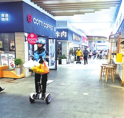 晚饭高峰,外卖员常常一次取多个外卖。 陈小川 摄