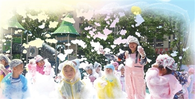 市北区第二实验幼儿园的萌娃们上演“泡泡大作战”。