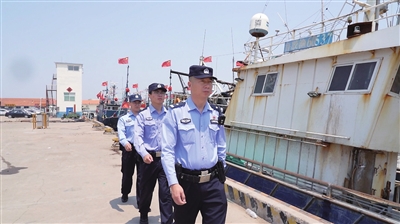 5月是休渔期,营海码头靠泊着大大小小的渔船,用缆绳紧紧拴在一起。5月28日上午10时许,记者跟随双营派出所民警在码头巡逻时注意到,虽然大部分渔船上没人,但民警巡逻时依然一丝不苟,遇到异样的地方,会驻足仔细观察一番。