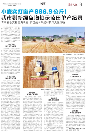 6月26日,记者从全市“三夏”生产新闻发布会获悉,截至6月25日,青岛市小麦全部收获完毕,380万余亩秋作物播种结束,夏管有序推进。今年“三夏”生产呈现“政策好、人努力、天帮忙”的特点,特别是通过系统实施绿色增粮战略,首次组织的全市绿色增粮竞赛中,7个地块亩产超800公斤,其中即墨区蓝村街道刘君绪的示范田以实打亩产886.9公斤创全市高产示范田单产历史最高纪录,实现技术集成创新重大突破。