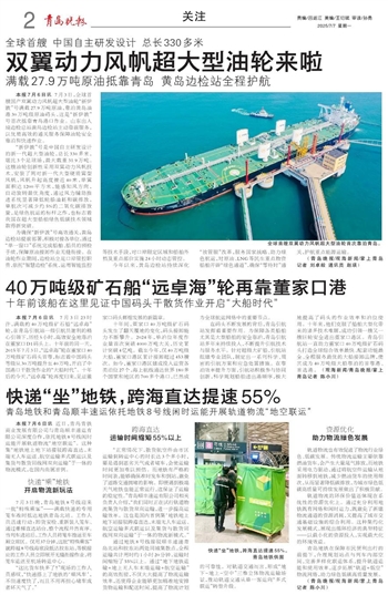 全球首艘双翼动力风帆超大型油轮首次靠泊青岛。