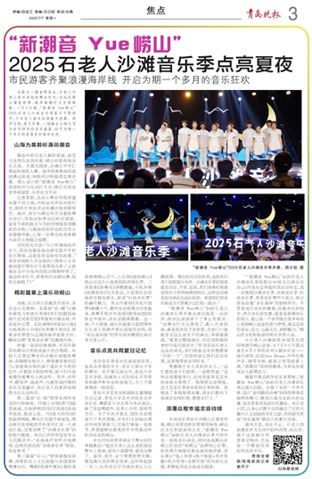 “‘新潮音 Yue崂山’2025石老人沙滩音乐季将推出10场文化演出活动,以内容生态串起时尚活动生态,进一步展现沙滩音乐季、亲海音乐季、时尚音乐季、青春音乐季四大亮点,树立青岛浪漫‘音乐海岸’的独特符号。不管是流行音乐的激情,民族音乐的恢宏,西方音乐的优雅,或者是新潮音乐的高亢,要让每一个音符吸引更多年轻人来到崂山追逐热爱与梦想,感受这里的青春、活力、山海文化、独特魅力。”崂山区文化和旅游局相关负责人说。