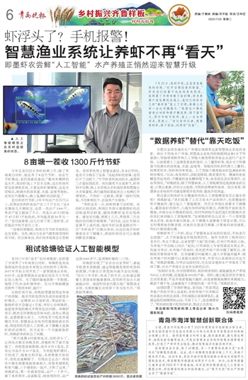 回到即墨丁字湾虾塘边,老闫说:“我是周边养殖户里较早用上设备的,有的养殖户后来购买的设备比我的还高级,手机端提示溶氧降低后,直接远程控制增氧机启动,节省了人工,连巡塘都省了。”那些曾经靠天吃饭的虾农,想法正在改变。