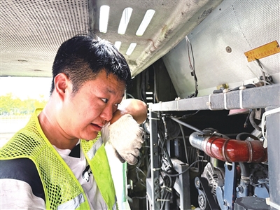 夏季的维修作业如同“蒸笼挑战”,尤其是地沟作业时温度超40℃。臧传凯总备两套工服替换,脸上混着油污和汗水,却从无怨言。“只要车队和乘客需要,我们随时顶上。”在这个多数人享受空调凉风的夏天,臧传凯和同事们始终与高温赛跑,守护着城市公交的脉搏。他们用专业和速度架起故障与畅通的桥梁,用汗水诠释着“城市守护者”的担当——无论能否当场修好,他们永远第一时间出现在需要的地方。