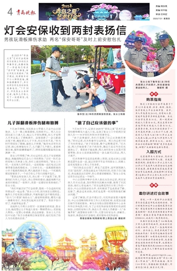 在2025年“青岛之夏”艺术灯会现场担任安保工作的任杰和鲁华宝,执勤时做了一件在他们眼里“很平常”的事情,却让市民大受感动。“孩子调皮,玩滑板车时不小心摔倒在地,腿和胳膊擦伤了,多亏这两位同志及时给他消毒包扎。”7月30日,市民张女士告诉记者,她和儿子每人写了一封感谢信,送到中山公园。