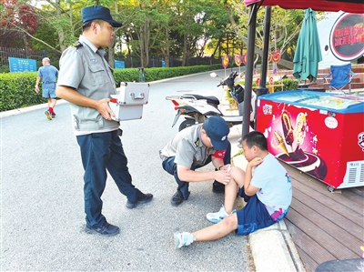 “看到这些安保人员,我心里一下子就有了底,看着他们为我儿子包扎,我心里特别感动,就趁他俩不注意的时候拍了一张照片,我想一定要好好表扬他们。”张女士说。