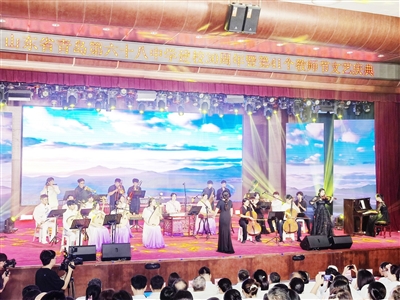 本报9月10日讯 9月10日正值第41个教师节,当天下午,青岛六十八中学校礼堂内掌声雷动,以“春华秋实三十载,继往开来启新程”为主题的建校三十周年校庆暨教师节文艺庆典在此热烈举行。师生与嘉宾齐聚一堂,致敬耕耘者,共赴新征程。