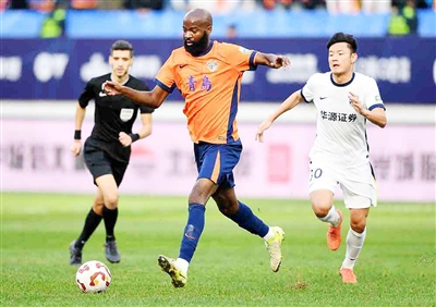 青岛海牛队球员兰克尔泽(中)在比赛中带球突破。
