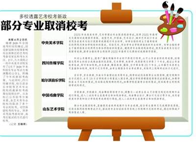 随着 2020年全国高考时间的确定,因受新冠肺炎疫情影响而全面推迟的艺考校考备受家长和考生关注。 2日,九大美院之一的中央美术学院发布了《关于2020年本科招生专业考试方案调整的公告》,明确了今年的新招考政策。与此同时,四川传媒学院、哈尔滨音乐学院等艺术专业院校的最新校考政策也陆续出炉。从各校已公布招考方案来看,各艺术类专业院校均取消了多个专业的校考,对仍保留校考的专业,则多采用高考前初审、高考后复试的方式进行校考。