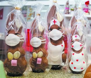 8日,在德国皮尔马森斯一家甜品公司拍摄的戴口罩的“复活节兔”巧克力。新华社发