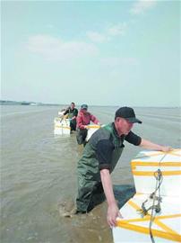 上午10时许,记者来到养殖滩涂,正赶上退大潮,20多名渔民集结在滩涂边。只见一辆满载蛏苗的箱货赶到后,渔民们忙着将蛏苗卸下车。 11时许,潮水退去,海边隐约露出泥滩,渔民将装有蛏苗的保温箱放到皮筏上。每个皮筏长约1.6米,宽约0.5米,而每个保温箱的蛏苗重约60斤,每个皮筏上装有三四箱蛏苗,渔民们便借着海水的浮力,推着蛏苗朝着放养区域艰难行进。
